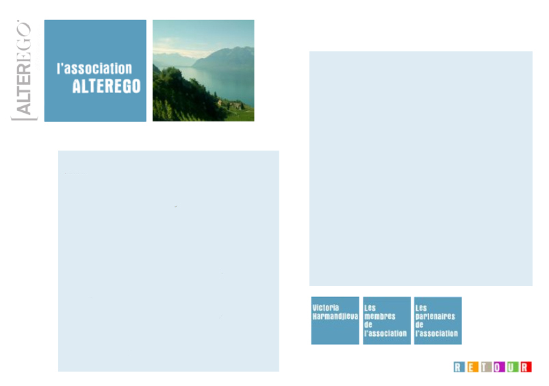 L’association AlterEgo, fondée par Victoria Harmandjieva en 2003, a pour but la création, la réalisation, la production et la diffusion de tout projet artistique contemporain en Suisse et à l’étranger. AlterEgo suscite le potentiel de la rencontre dans le contexte artistique et propose des projets qui s’articulent autour de l’échange artistique et de l’énergie qu’il comporte. AlterEgo met en lumière la dynamique et le mouvement qu’engendre le lien établi entre les différentes expressions artistiques et les artistes eux-mêmes, afin que leurs expériences aboutissent en un projet pluridisciplinaire.
