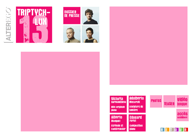 TRIPTYCH - LUX est la rencontre exceptionnelle entre trois entités fortes et autonomes : une pianiste, un jazzman et un plasticien des lumières.
